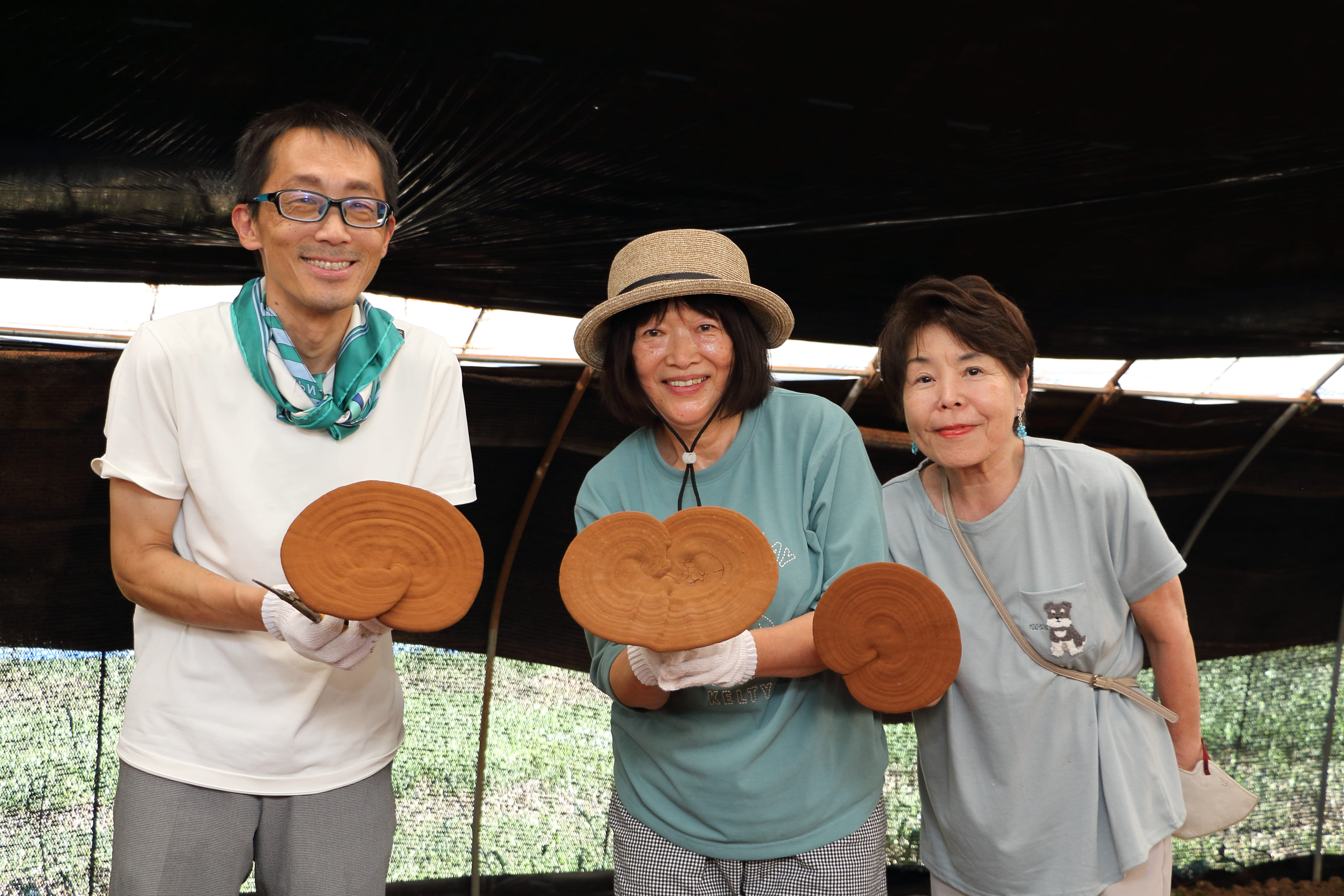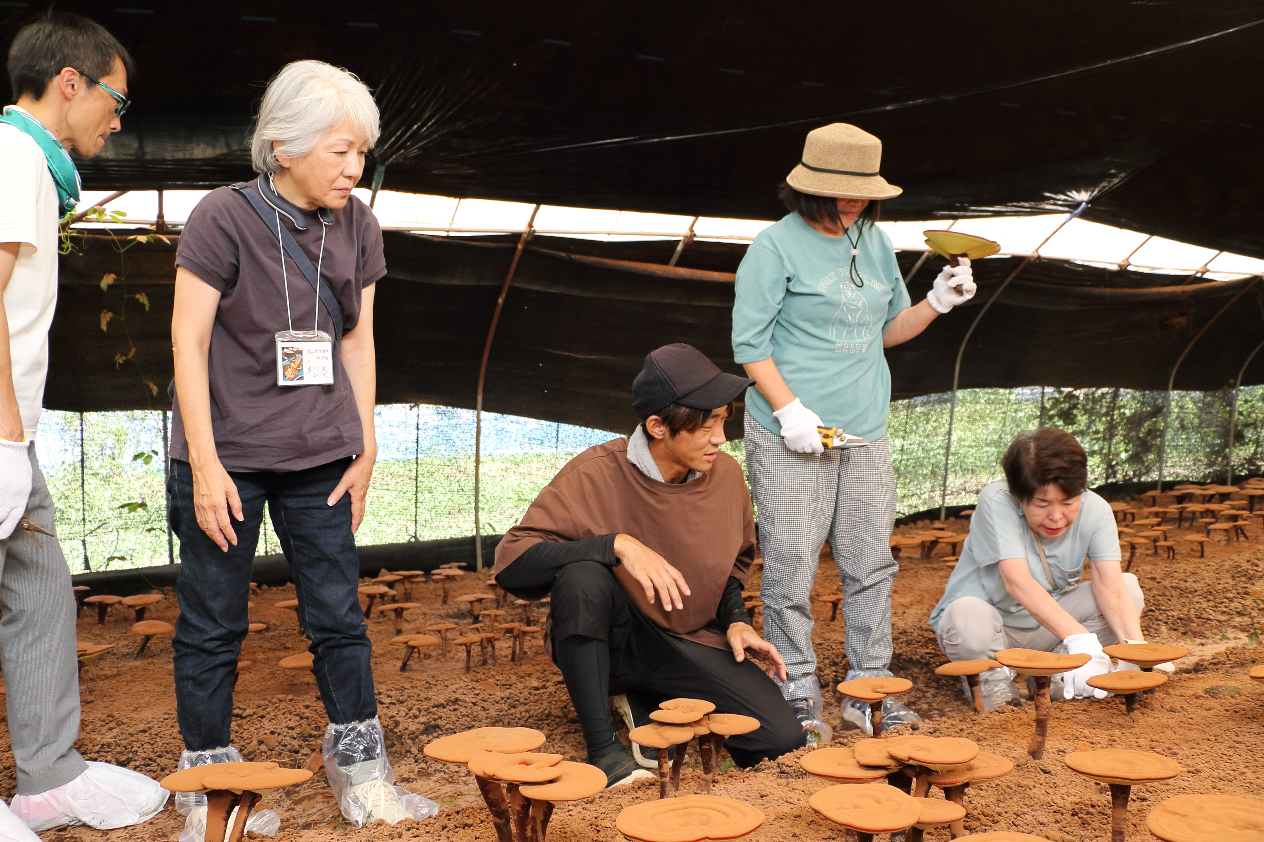 農家の皆さんに霊芝の育て方や畑のことを教えていただきながら順番に刈取りを体験。